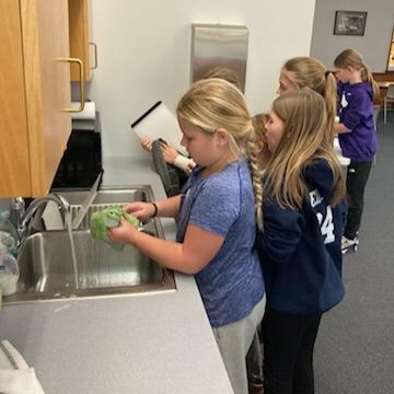Sweet treats from scratch were on the menu for this pre-Halloween session. The Cooking Crew made oven-baked donuts with glazed frosting and sprinkles, and vanilla pudding. Did you know there are pans designed for baking donuts instead of frying them? Now you do, and so do the kids and a bunch of parents and staff who had never seen them before either! Tasty donut goodness and yummy, smooth vanilla pudding? Yes, please and thank you! Great job kids! And congratulations, Deb Haverkamp, on successfully testing a new recipe while wrangling a group of wired up boys and ghouls post-Halloween school parties!